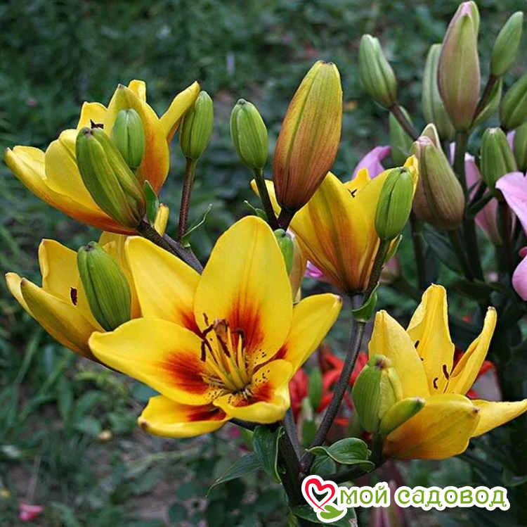 Оригинальная лилия с ее необычной окраской станет предметом восхищения гостей и соседей. Цветет этот сорт в середине июля. На стебле образуется до 7 цветков направленных вверх. Лепестки среднего размера, желтые, с красно-коричневым основанием и пыльниками, не отгибаются. Очаровательная лилия необычайно хороша в срезке. Высаживать Grand Cru (Гранд Крю) на клумбе лучше среди многолетников с желтыми или синими цветками. Посадка лилии: Глубина посадки лилии зависит от почвы. Если почва легкая – можно углубить на 12-13 см, что составляет 3-4 диаметра луковицы. Если же почва глинистая или тяжелая, достаточно двух диаметров, глубина лунки не более 5 см. В выкопанную ямку насыпьте слой песка, установите луковицу донышком на песок, присыпьте сверху остатками грунта, сверху замульчируйте. Уход за лилией: Пышных бутонов у лилий можно добиться, соблюдая обычные правила ухода: в первый год лилиям не нужна весенняя подкормка, удобрения вносятся разово за сезон, после цветения. Но это лишь в том случае, если перед посадкой вносилось удобрение. Перед началом цветения высокорослые сорта рекомендуется подвязать. После цветения засохшие бутоны удаляют. Полив умеренный: лучше не долить, чем перелить. Если цветок начал чахнуть и имеются подозрения на перелив – смешайте по столовой ложке речного песка и древесной золы, высыпьте под цветок и не поливайте ближайшую неделю. Полив лилии важно проводить под корень, старайтесь исключить попадание воды на листья, это провоцирует ожоги на солнце и распространение грибковых заболеваний.